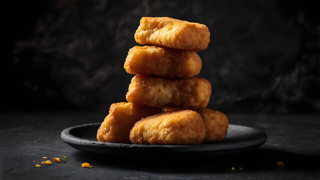 Crispy nuggets form a tall tower on a dark slate surface creating a strong dramatic gourmet visual style