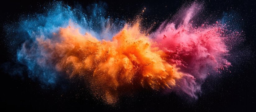 Colorful powder explosion on black background with blue, orange, and pink hues, creating dynamic and vibrant visual effects with Copy Space