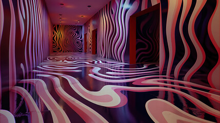 A striking hallway features flowing wave patterns in pink and purple hues, illuminated by colorful lights, creating a dynamic and artistic atmosphere during nighttime.