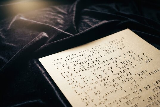 Beige paper with braille text for blind people on a dark velvet surface with natural sunlight. Visual impairment and accessibility concept.