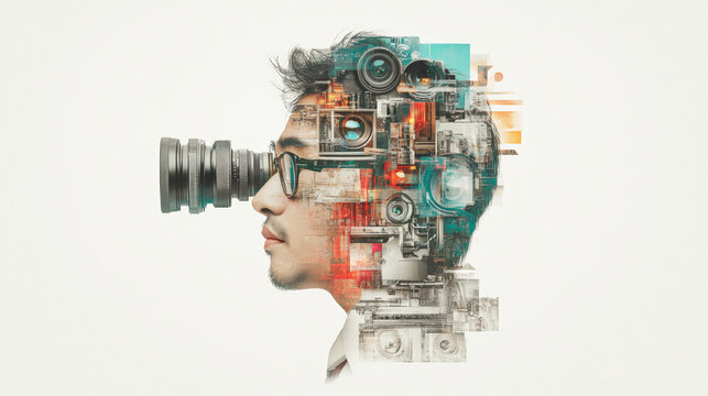 A creative artwork blends a man's profile with camera elements, symbolizing a fusion of human perception and photographic technology.