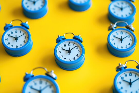 Bright blue timers arranged on a vivid yellow background showcasing a modern design and playful aesthetics suitable for various settings