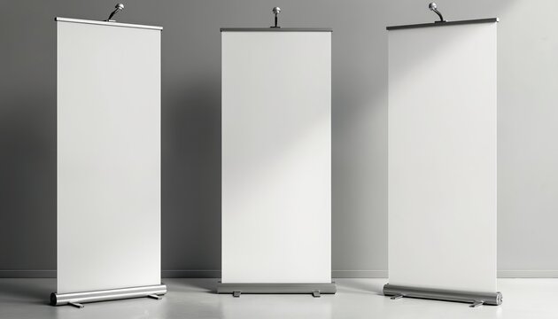 Three blank rollup banners mockup stand indoors. Empty banners template, exhibition marketing. Modern advertisement design presentation. Space for text. Trade show portable display stand for company.