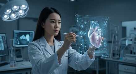 Female Doctor Using Holographic Technology to Analyze a Human Heart