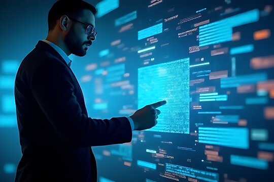 Asian young male analyzing data on futuristic digital screen in a tech environment