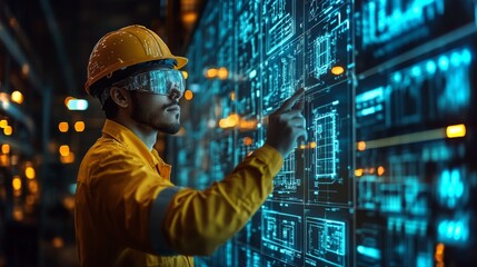 Holographic projection showcasing renewable energy solutions in a high-tech industrial facility