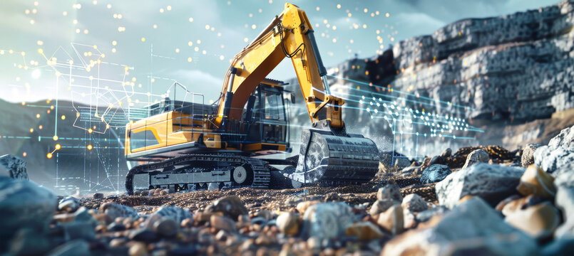 A yellow excavator works on a rocky terrain with a futuristic data visualization overlay of graphs and numbers