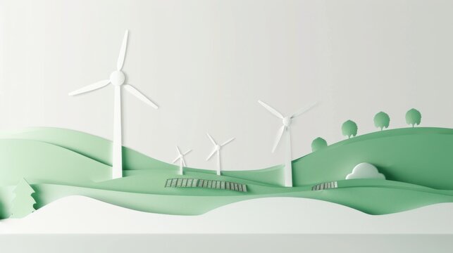 A conceptual visualization of solar panels and wind turbines integrated into a serene landscape, all in shades of green on a plain white background