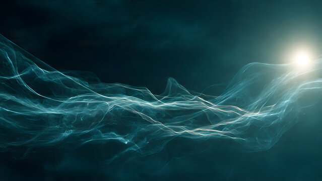 Abstract ethereal glowing light waves flowing through a dark deep space nebula with a bright sun flare illuminating the cosmic scene in a mesmerizing digital art visualization