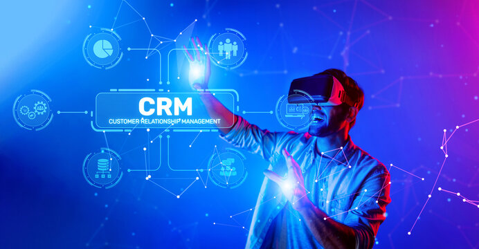 A dynamic scene showcases a man using virtual reality technology to explore CRM solutions, emphasizing innovative strategies for effective customer engagement and management. XDMCP