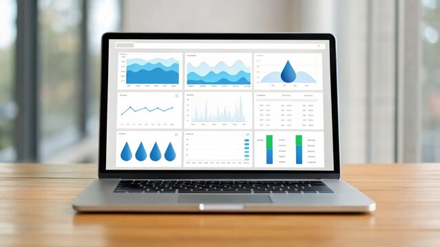 A sleek laptop displays data visualizations related to water metrics, featuring graphs and charts on a wooden table in a bright setting.