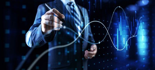 Businessman analyzing interactive analytics dashboard showing bar charts pie charts KPI graphs visual data reports performance metrics digital technology smart finance strategic tools