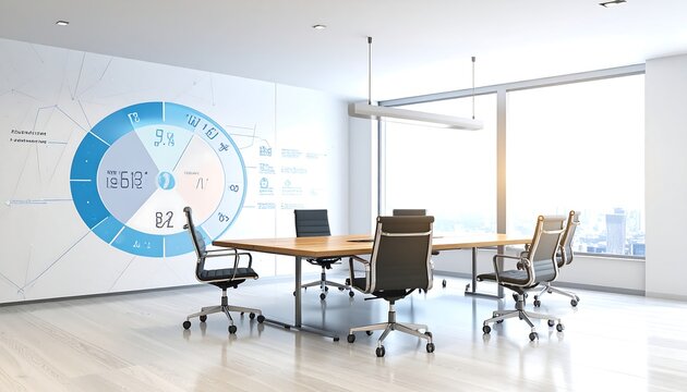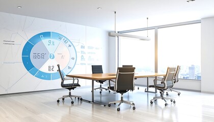 Modern conference room with large window, wood table, and data visualizations on wall