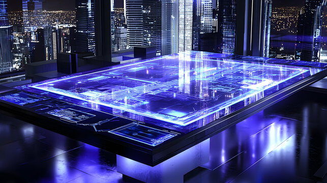 AI interface projected in mid-air with complex data visualizations and neural networks