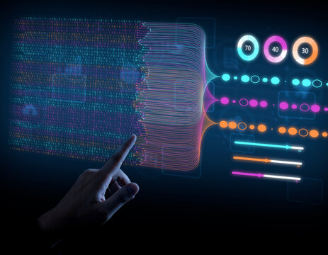 Business analytics, finance, neural network, AI,Big data technology and data science. Data scientist querying, analysing and visualizing complex data set on virtual screen. Data flow concept.