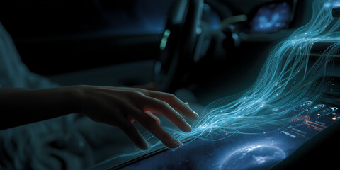 Vector threads link hand to dashboard, visualizing AI control signal flow.