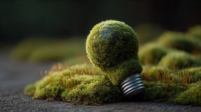 Moss-covered lightbulb representing sustainable innovation, eco-friendly ideas, green technology, and environmentally conscious solutions in a visually striking concept.