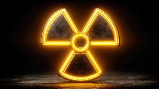 Neon radioactive sign glowing with bright yellow electric lines, stylized hazard symbol in glowing neon for science, nuclear, or energy visuals