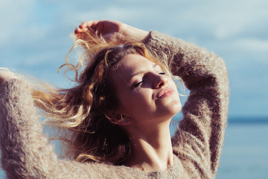 Happy woman outdoor wearing jumper
