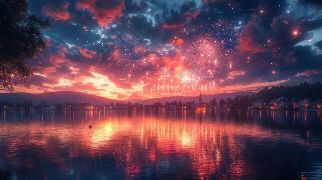 Stunning photo captures vibrant fireworks exploding over a tranquil lake at dusk, with colorful reflections. The sky is ablaze with hues