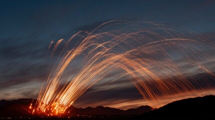 Vibrant red fireworks exploding amidst cloudy sunset sky