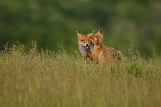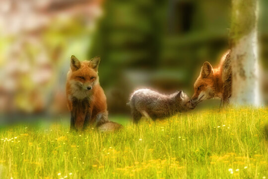 A red fox mom vixen and 2 kits appear outside their den   Mom scans the area for danger as the kits cling to her side kits cubs female babies den red alert spring : Generative AI