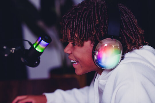 Young gamer streaming with neon-lit headphones using a microphone in a casual indoor setup during the evening