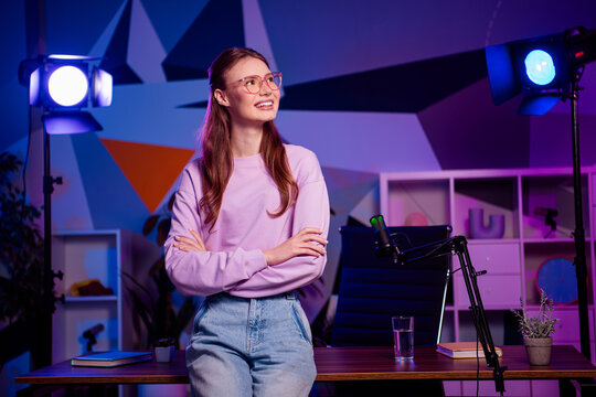 Young woman in a vibrant room with neon lighting preparing for a live podcast session or creative vlog content creation