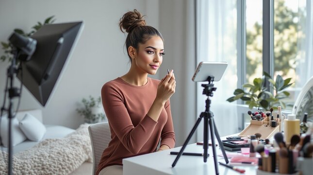 Vlogger Creating Makeup Tutorial At Home In Bright Room Images