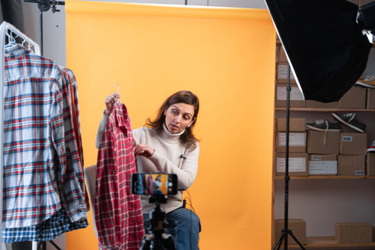 Millennial female vlogger recording content for online fashion channel on social media, giving advice. Vlogger job. Showing clothes.