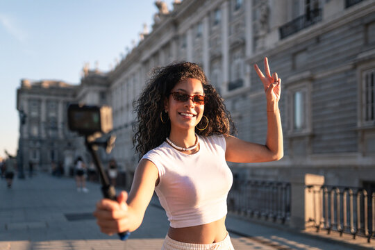Tourist vlogging with a selfie stick in front of a European monument, who is making a peace sign while filming.