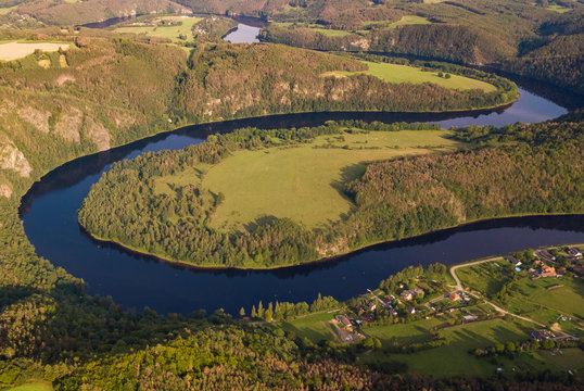 Beautiful view of Vltava river from Maj viewpoint. Czech Republic, Krnany, Europe. Maj viewpoint next to Prague in central Bohemia, Czech Republic. Aerial view of incredible Vyhlidka Maj.