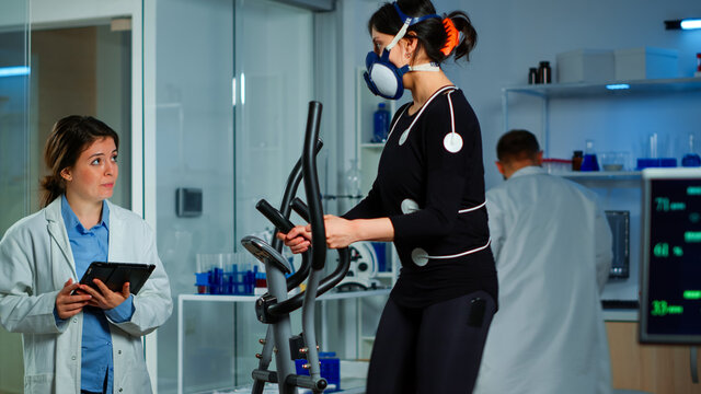 Team of doctor researchers monitoring endurance of woman performance sports wearing mask running cross trainer. Lab science doctor measuring vo2 of sportswoman, holding tablet explaning health status