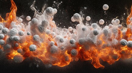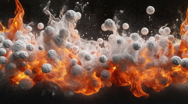 Explosive material disintegration, intense heat and smoke.  A large, grey, pulverized mass explodes outwards, producing a fiery, smoky cloud