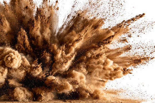 A dynamic explosion of white powder dispersing outwards against a clean white background, creating a cloud of fine particles.