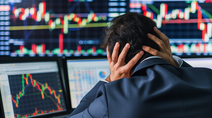 Stressed stock trader clutches his head, surrounded by multiple computer screens displaying volatile market data and stock charts.