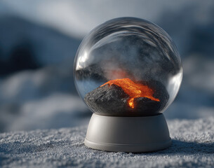 Glass snow globe with miniature volcano and glowing lava inside, resting on textured surface, evokes wonder and curiosity