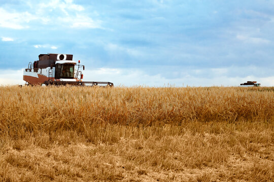 grain harvesting, combines in a wheat field, Russia, Volgograd region, July 31, 2025