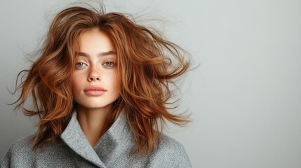 A woman with striking red hair wearing a grey coat, exuding confidence and charisma. The focus is on her voluminous hair and intense gaze.