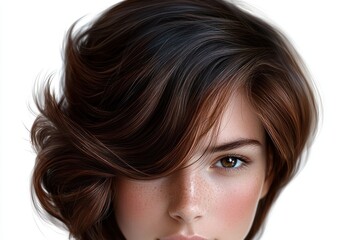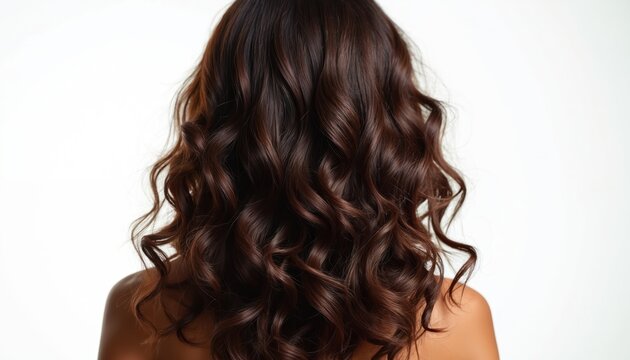 close-up of voluminous wavy brown hair with glossy highlights against a white background conveying an elegant, poised, confident mood