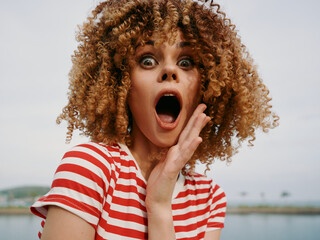 Surprised young woman with voluminous curly hair and wide eyes wearing a red striped shirt outdoors near water, capturing dramatic astonishment and candid emotion in bright color.