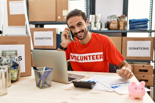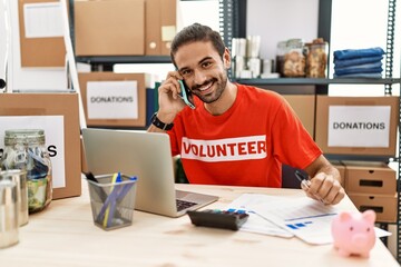 Handsome hispanic man working as volunteer doing countability speaking on the phone at donation stand