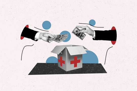 Composite collage picture image of hands give money banknotes boxes donation medicament weird freak bizarre unusual fantasy billboard