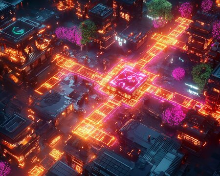 Urban smart city transformation siamrat digital art visualization futuristic environment aerial perspective blockchain technology integration