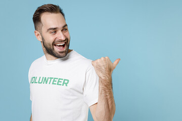 Side view funny young bearded man in white volunteer t-shirt pointing thumb aside on mock up copy space isolated on blue background studio. Voluntary free work assistance help charity grace concept.