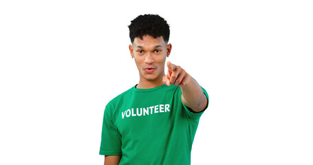 Volunteer, charity and portrait of man with hand pointing for selection, choice or vote for community service. Opportunity, invitation and male person on isolated, transparent and png background