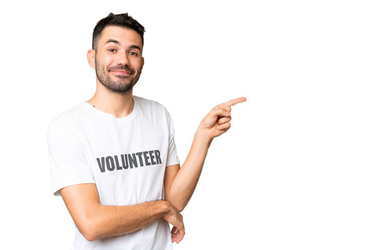 Young volunteer caucasian man over isolated chroma key background pointing finger to the side