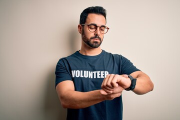 Young handsome man with beard volunteering wearing t-shirt with volunteer message with surprise face pointing finger to himself
