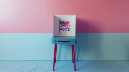 Interior of an empty polling place in the US. Row of empty white voting booths with American flags at the ballot station. Elections in the USA, democracy concept