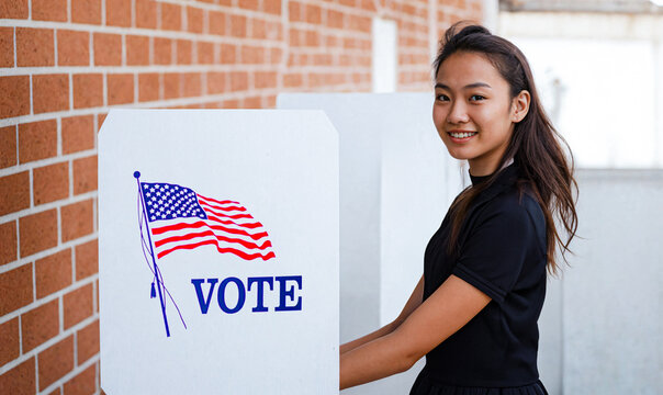 A young Asian American woman is seen casting her vote at a voting booth during the USA general elections. The image captures the diversity, inclusion, and empowerment of women voters and asian